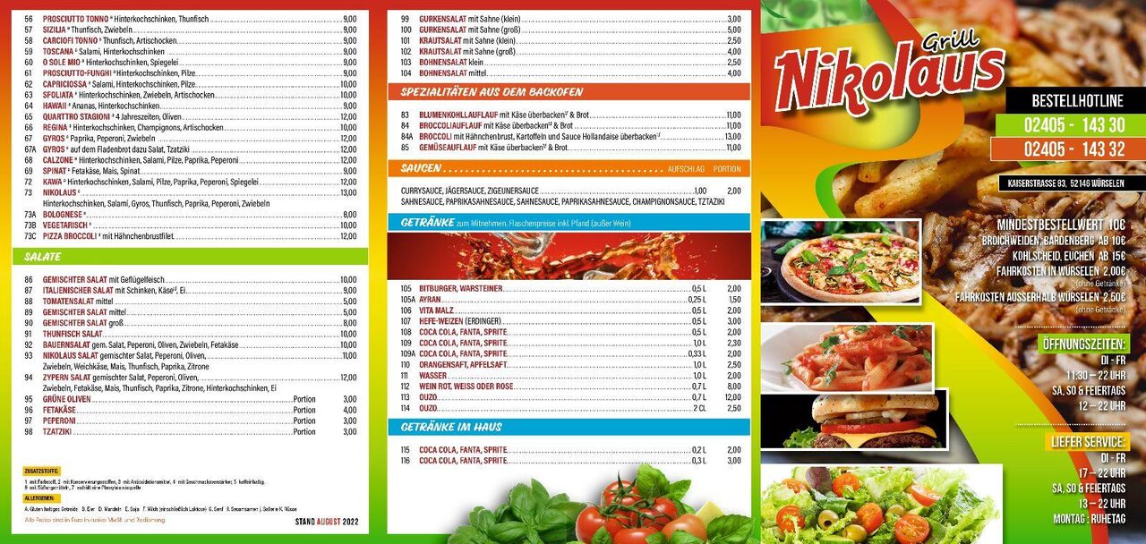 Genießen Sie die warme Atmosphäre und Gastfreundschaft des Nikolaus Grill in Würselen. Ein herzliches Willkommen! Lassen Sie sich von unserer köstlichen Auswahl an griechischen Gerichten verzaubern. Unser freundliches Personal serviert Ihnen hier bestes Fast Food, Hausmannskost, regionale Produkte und traditionelle Küche. Unsere schmackhaften Speisen erwarten Sie! Bringen Sie Ihre Freunde und Familie mit und genießen Sie sie. Genießen Sie dazu ein leckeres Bier in unserer gemütlichen Atmosphäre. Hunger? Besuchen Sie uns und genießen Sie ein leckeres Mittag- oder Abendessen in entspannter Atmosphäre.
